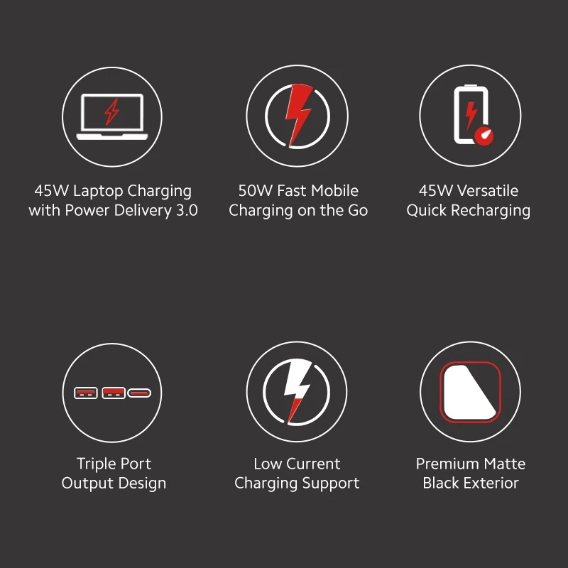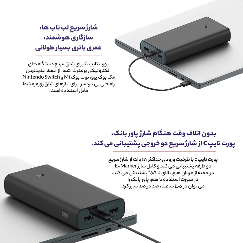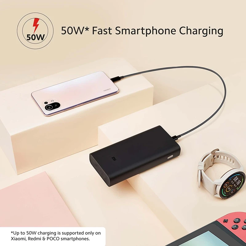 با استفاده همزمان از دو پورت Usb می‌توانید دستگاه‌های خود را با توان 22.5 وات در هر پورت شارژ کنید. پورت Type-C موجود روی بدنه این پاوربانک به صورت دو طرفه بوده که برای شارژ این پاوربانک نیز مورد استفاده قرار می‌گیرد. همچنین این پاوربانک از توانایی شارژ با شدت جریان کم برای شارژ دستگاه‌هایی مثل هندزفری بلوتوث و ساعت هوشمند نیز پشتیبانی می‌کند. پورت تایپ سی تعبیه شده در پاوربانک Mi 50W شیائومی، قابلیت جریان دوطرفه دارد. این به معنی این است که می توانید با کابل هایی که یک طرف آن تایپ سی باشد، دستگاه خود را ماکزیمم با توان 50 وات شارژ کنید. بوسیله این پورت می‌توانید تمام لوازم مثل گوشی موبایل، لپ تاپ و مک بوک، نینتندو و دستگاه‌هایی که پورت شارژر تایپ سی دارند را به راحتی با بالاترین سرعت شارژ کنید. مدت زمان مورد نیاز برای کامل شدن شارژ این پاوربانک نیز حدود 4.5 است